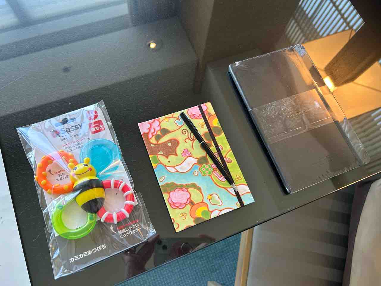Sassyの歯固めおもちゃと可愛らしいデザインのノートブック。